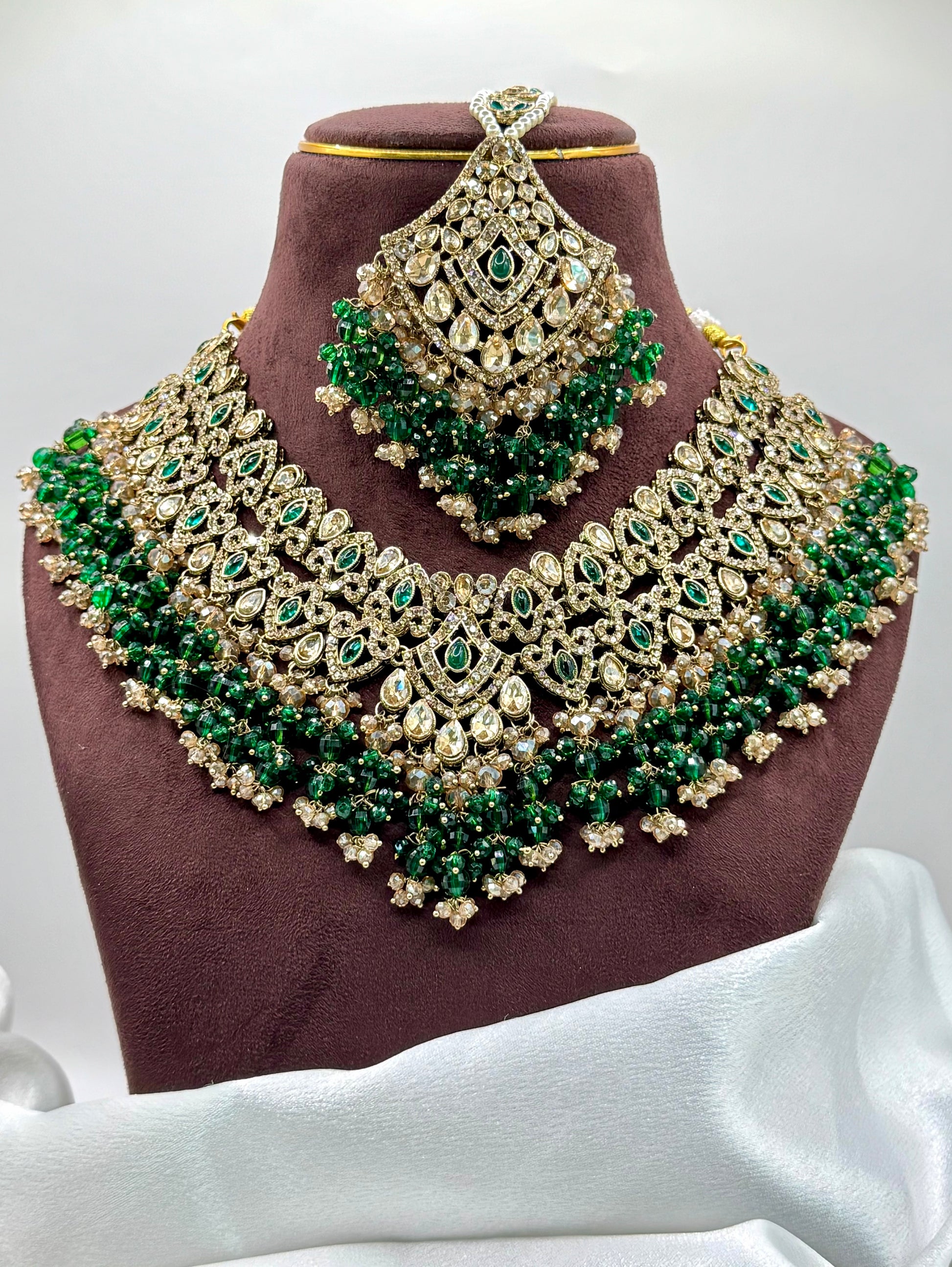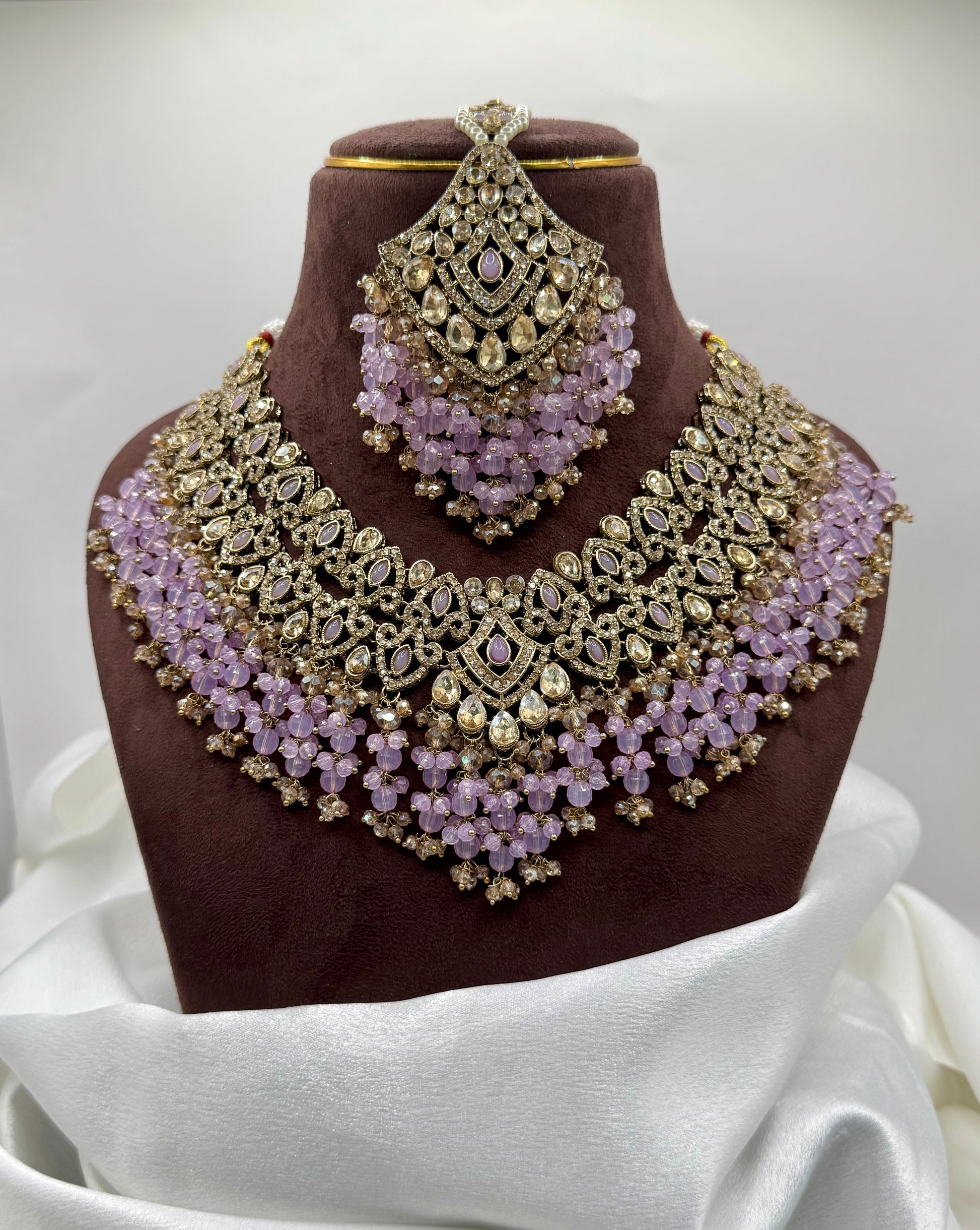 This set is absolutely stunning with gorgeous shadow stones that catch the light perfectly. The earrings look big at 4 inches, but they’re super lightweight and easy to wear. It comes with a unique style and a matching tikka, making it the perfect set to turn heads and make a statement wherever you go.