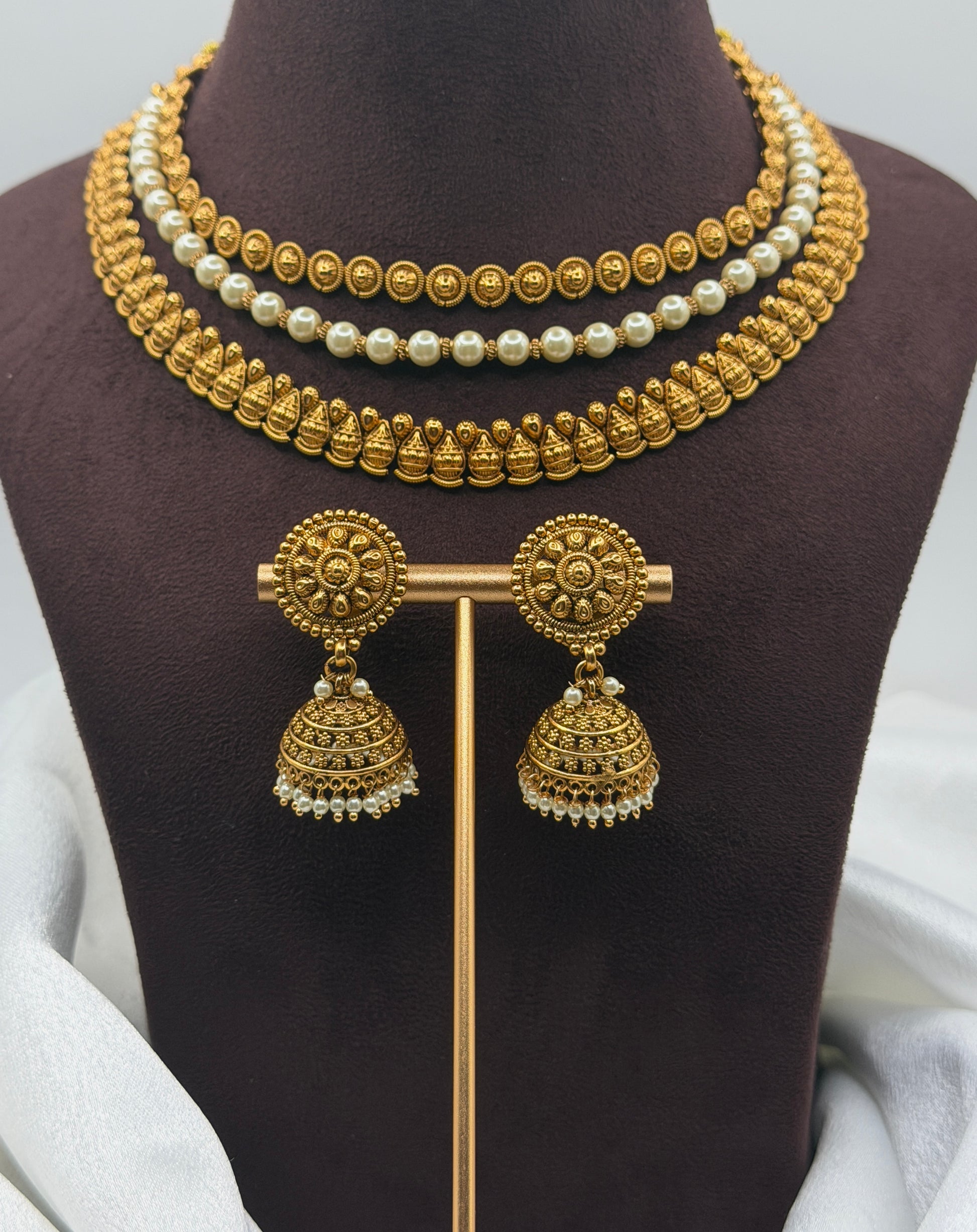 This elegant three-layer gold-plated necklace set features classic Jhumka, with the middle layer accented by delicate white pearls for a timeless touch. Lightweight and comfortable, it’s perfect for everyday wear or special occasions.