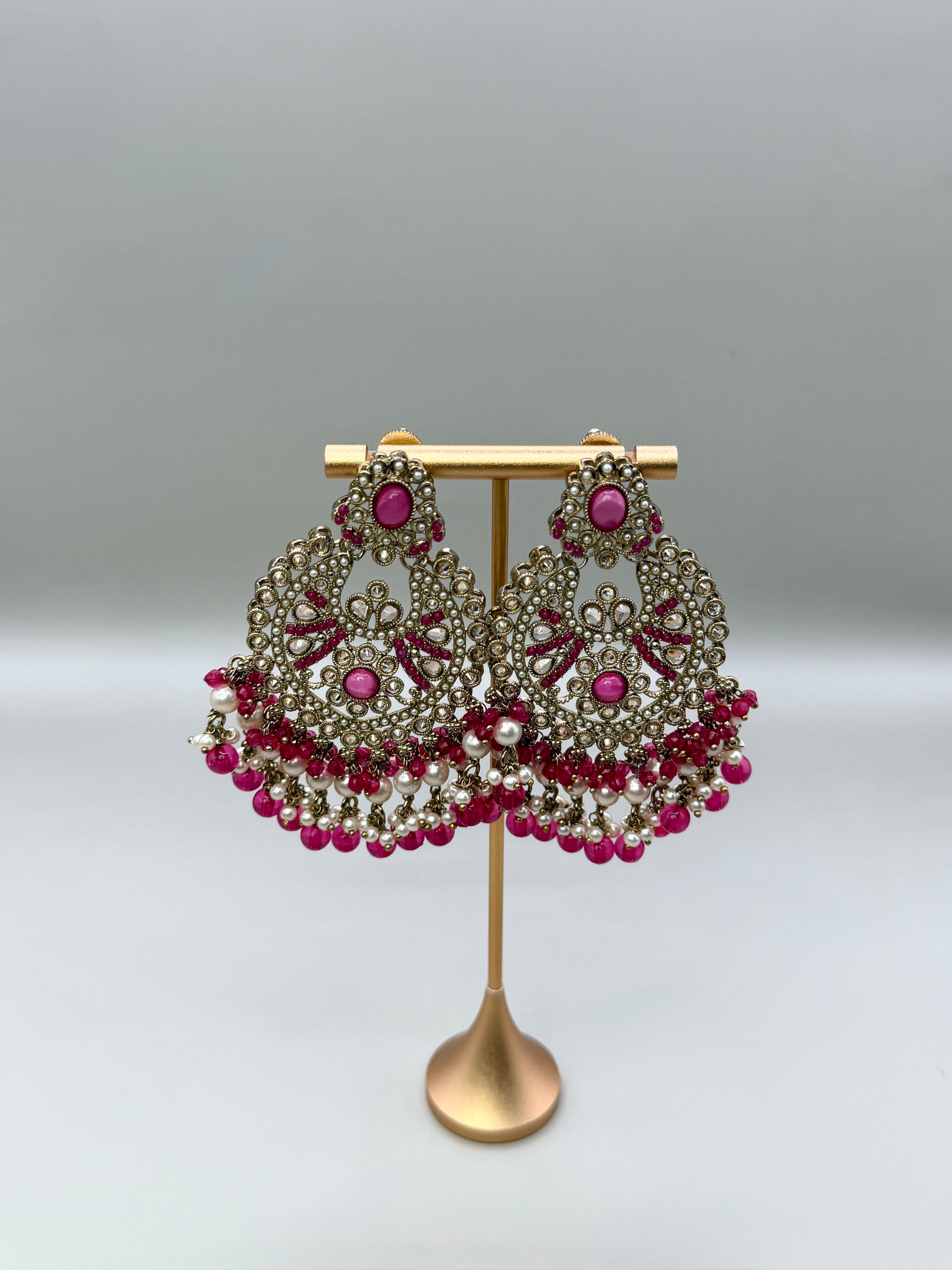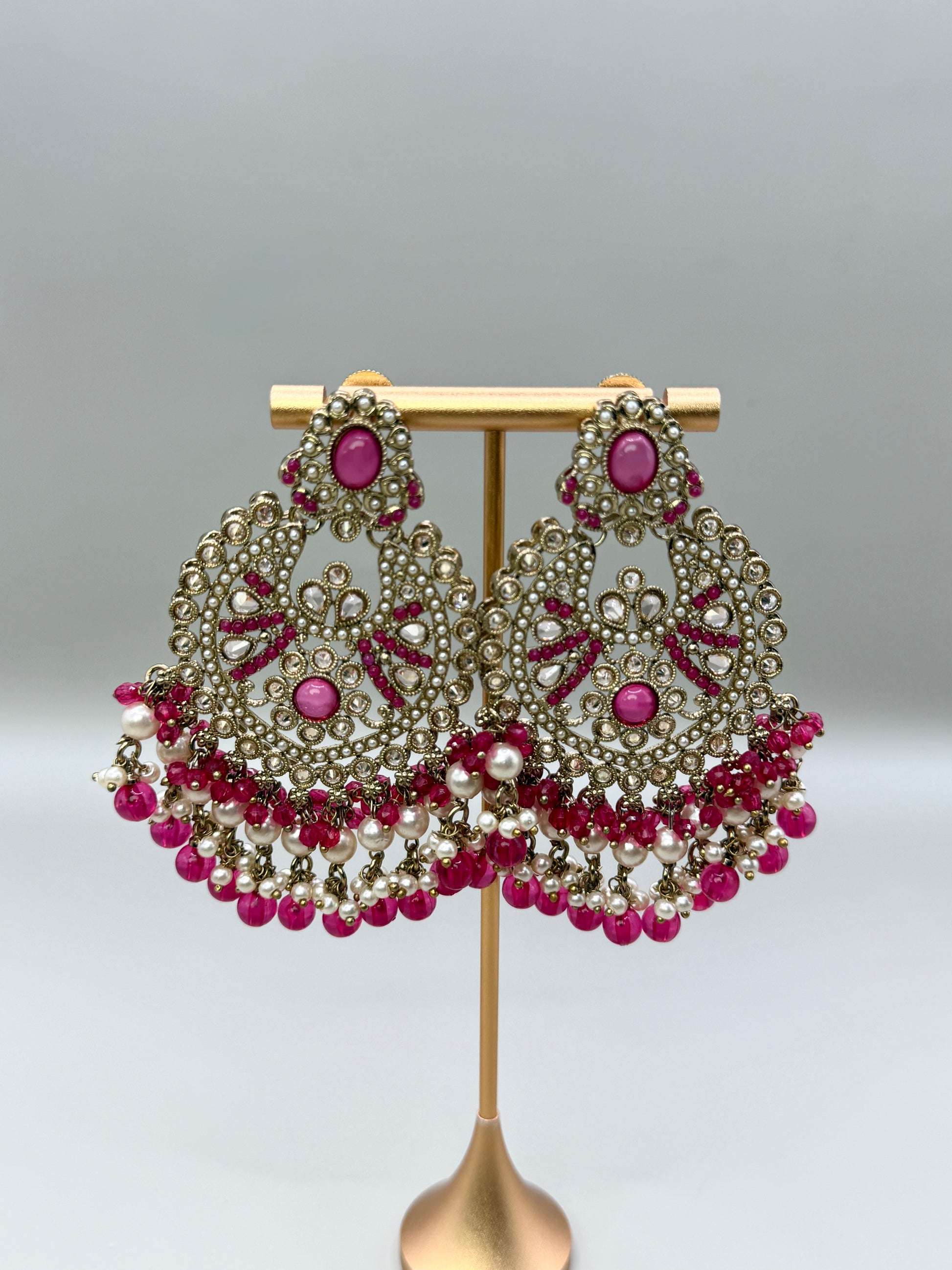 Gold-tone chandbali earrings featuring magenta stones and pearl drops. Elegant, lightweight, and perfect for festive or special occasions.