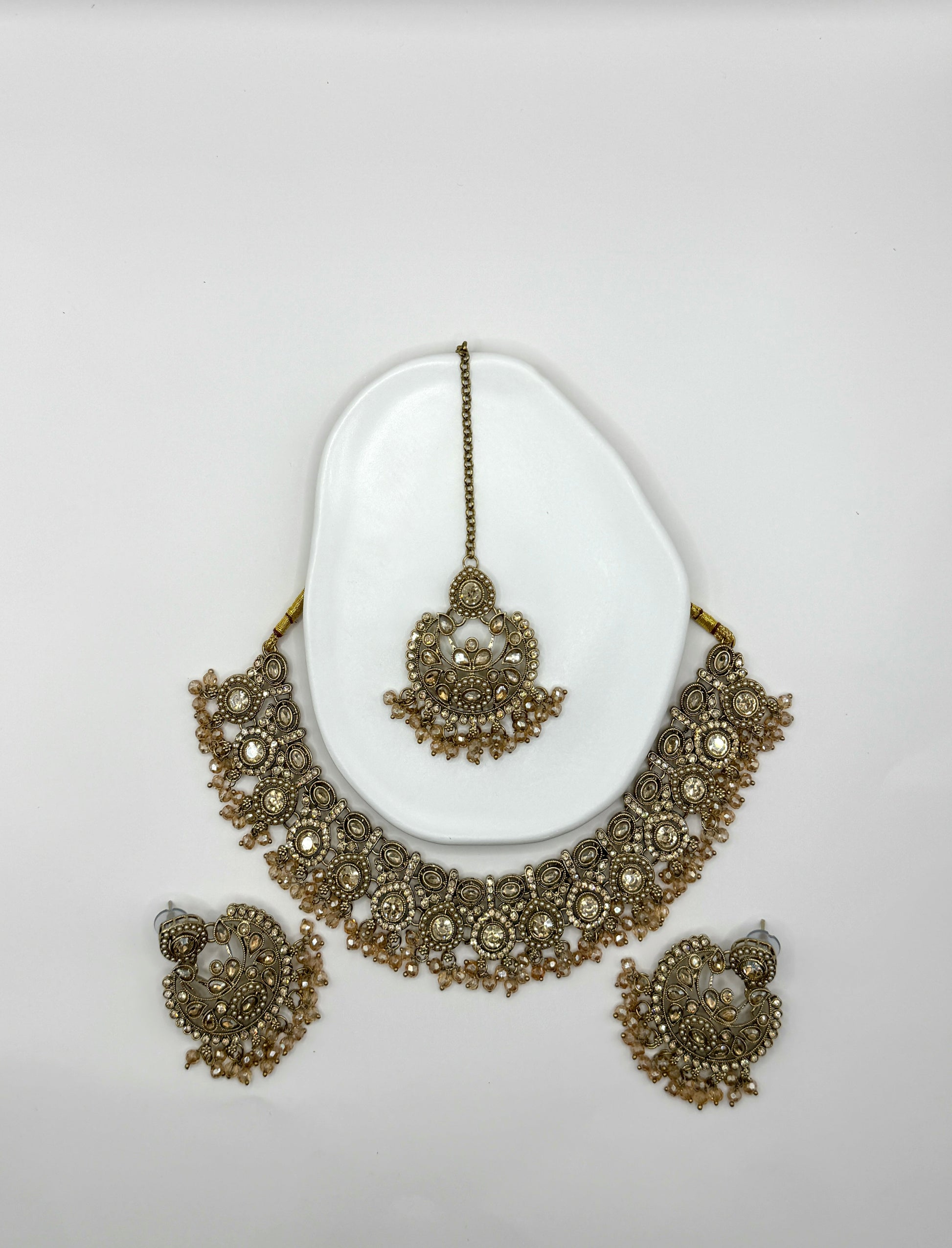 This gorgeous stonework necklace set features a brilliant shine that catches every light. Paired with 2-inch earrings and a matching tikka, it’s the perfect set to elevate your look for any occasion.