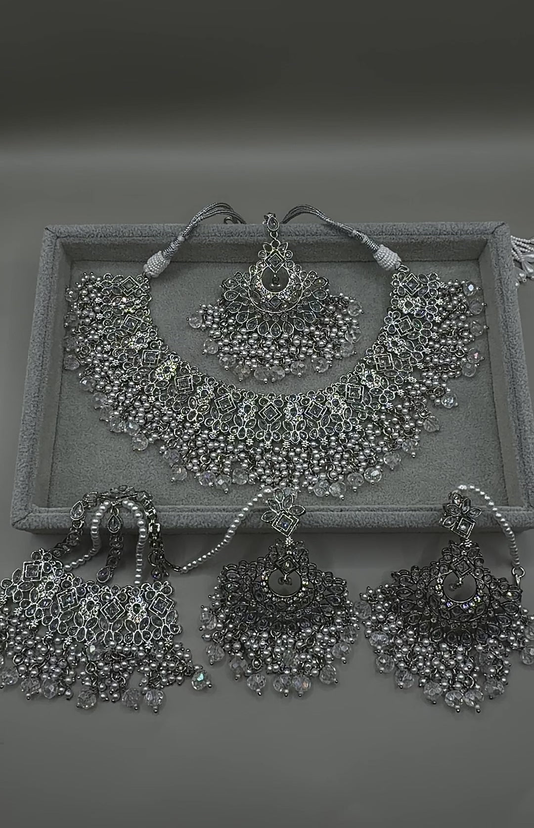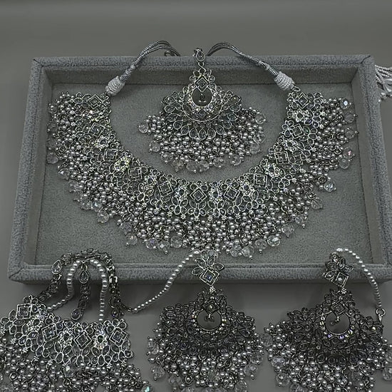 Make an unforgettable statement with this stunning icy silver Passa set, beautifully crafted with silver and white beads for a cool, elegant shine. The 3.5-inch earrings are lightweight and come with a delicate sahara (ear chain) for added support and comfort, making them feel even lighter during wear. The set includes a bold 5-inch Passa and a matching tikka — perfect for bridal looks, festive occasions, or when you simply want to stand out.