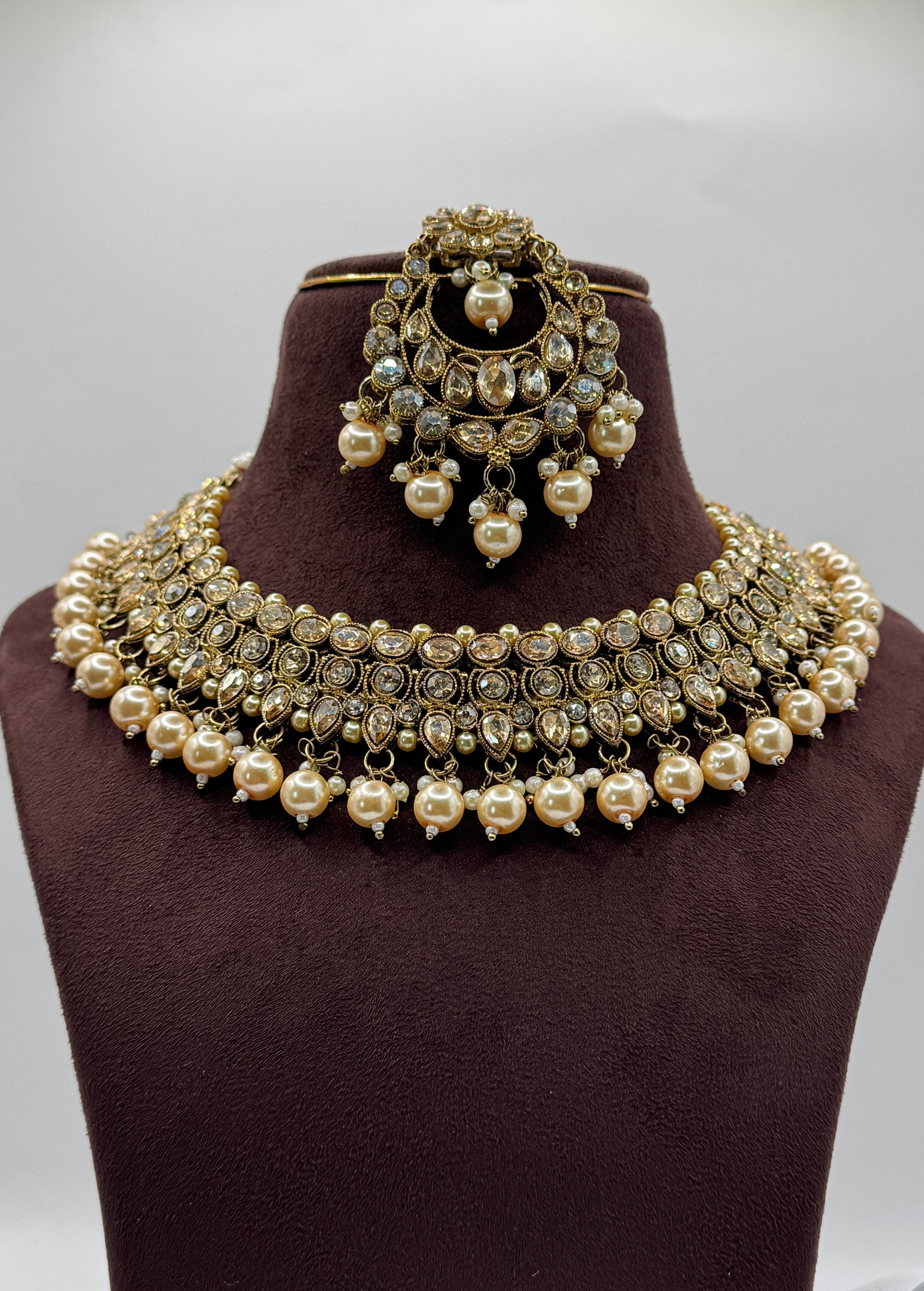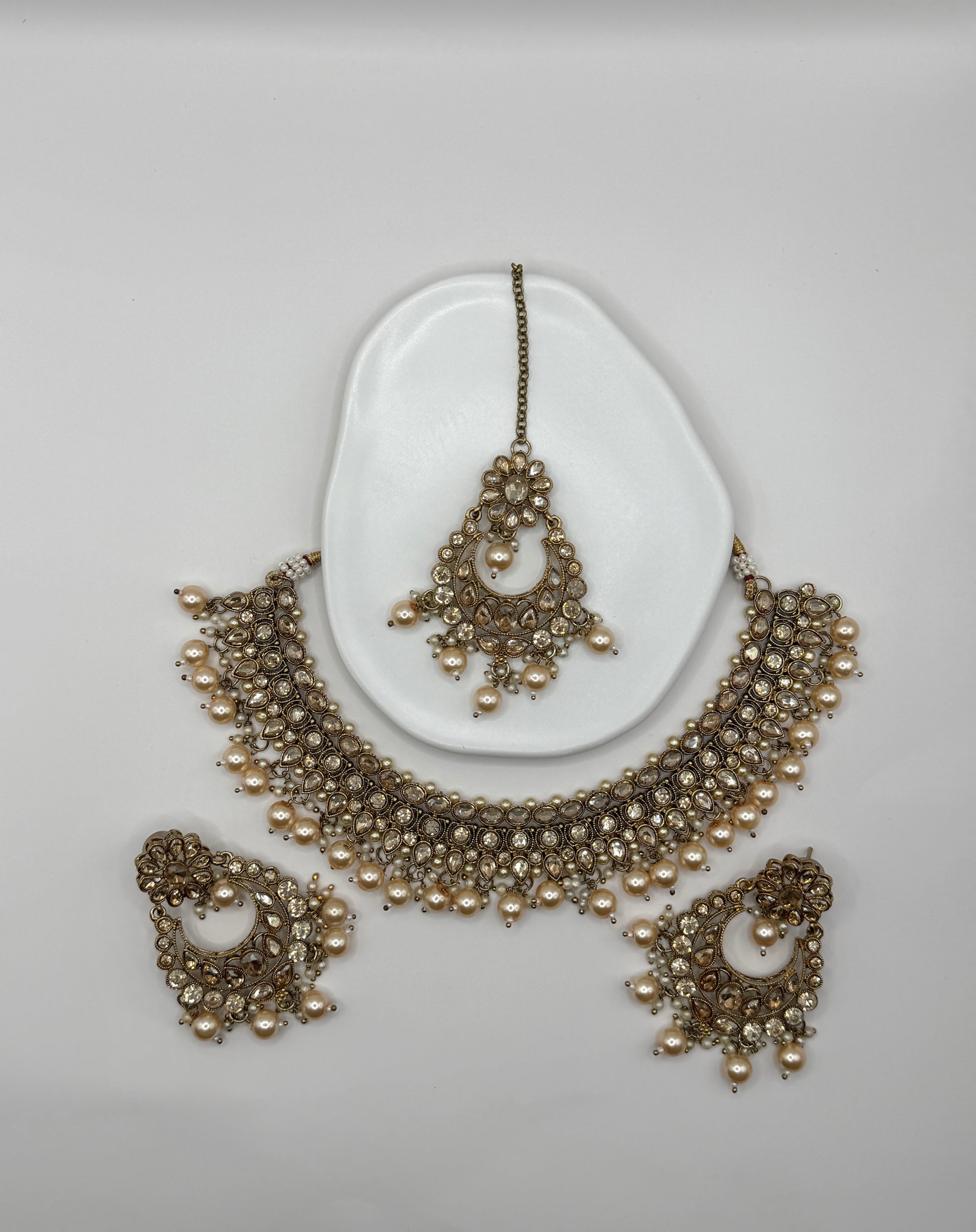 This beautiful necklace set features intricate stonework in a golden-champagne finish, adorned with white and champagne pearls for a soft, elegant glow. Complete with a tikka and 3-inch earrings, it’s perfect for adding a touch of sophistication to any occasion.