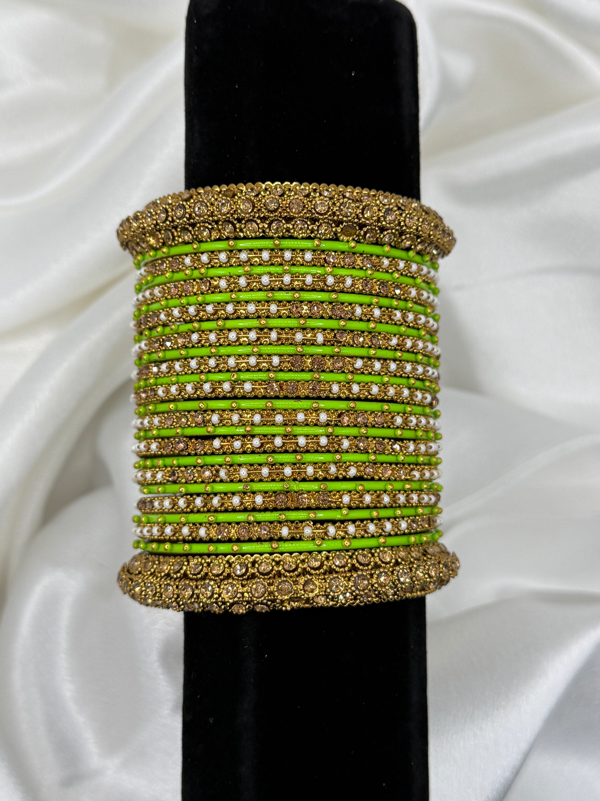 Add a pop of color and sparkle to your look with our stunning Lime Green & Gold Bangle Set. Handcrafted with shimmering stones and metallic detailing, these bangles bring together traditional elegance and modern shine. Perfect for festivals, weddings, or everyday glam.