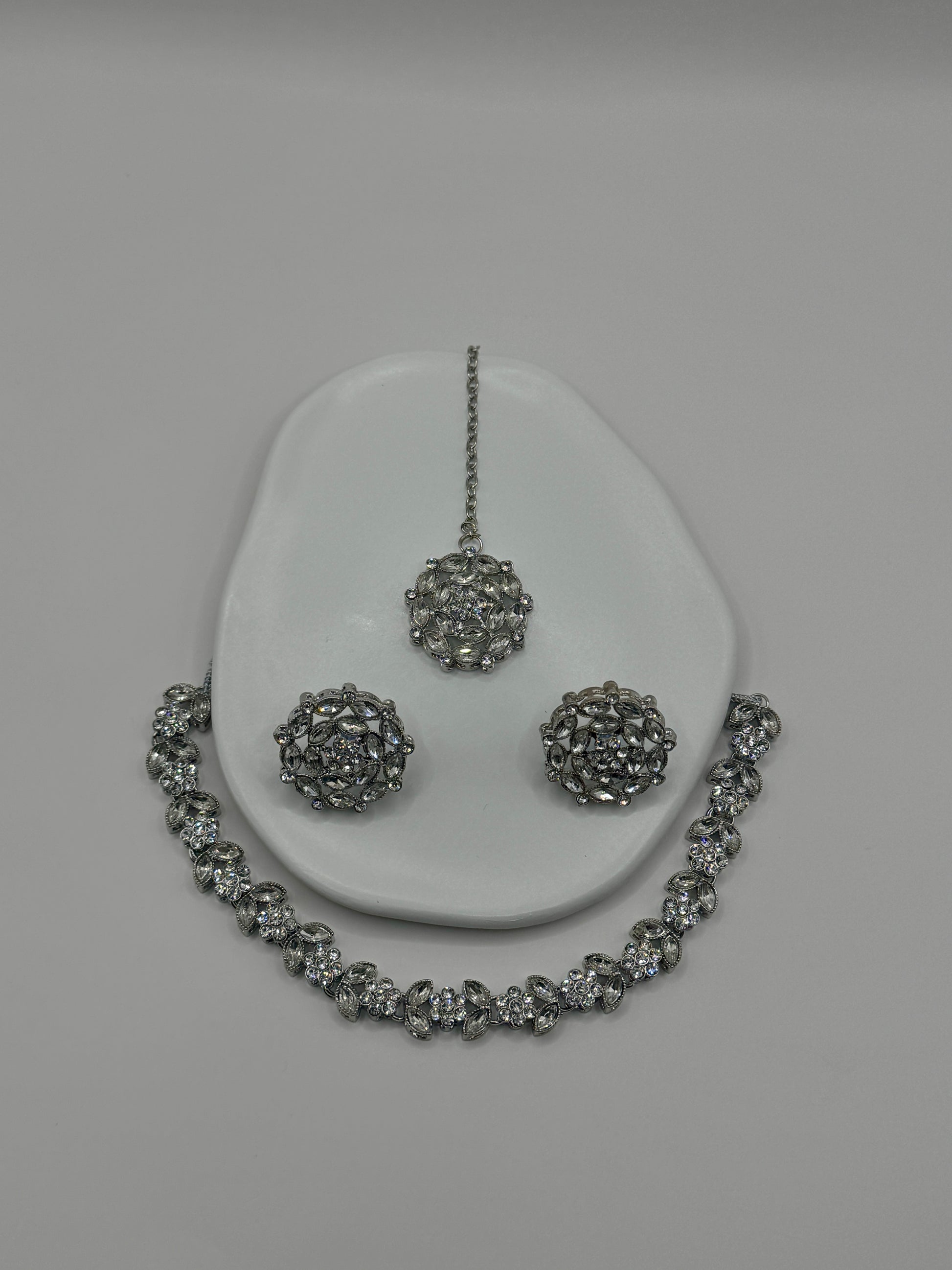 Elegant and timeless, this single-layer stonework necklace set comes with classic studs and a matching tikka. Perfect for those who love simple and graceful designs, it adds just the right touch of sparkle to any outfit.