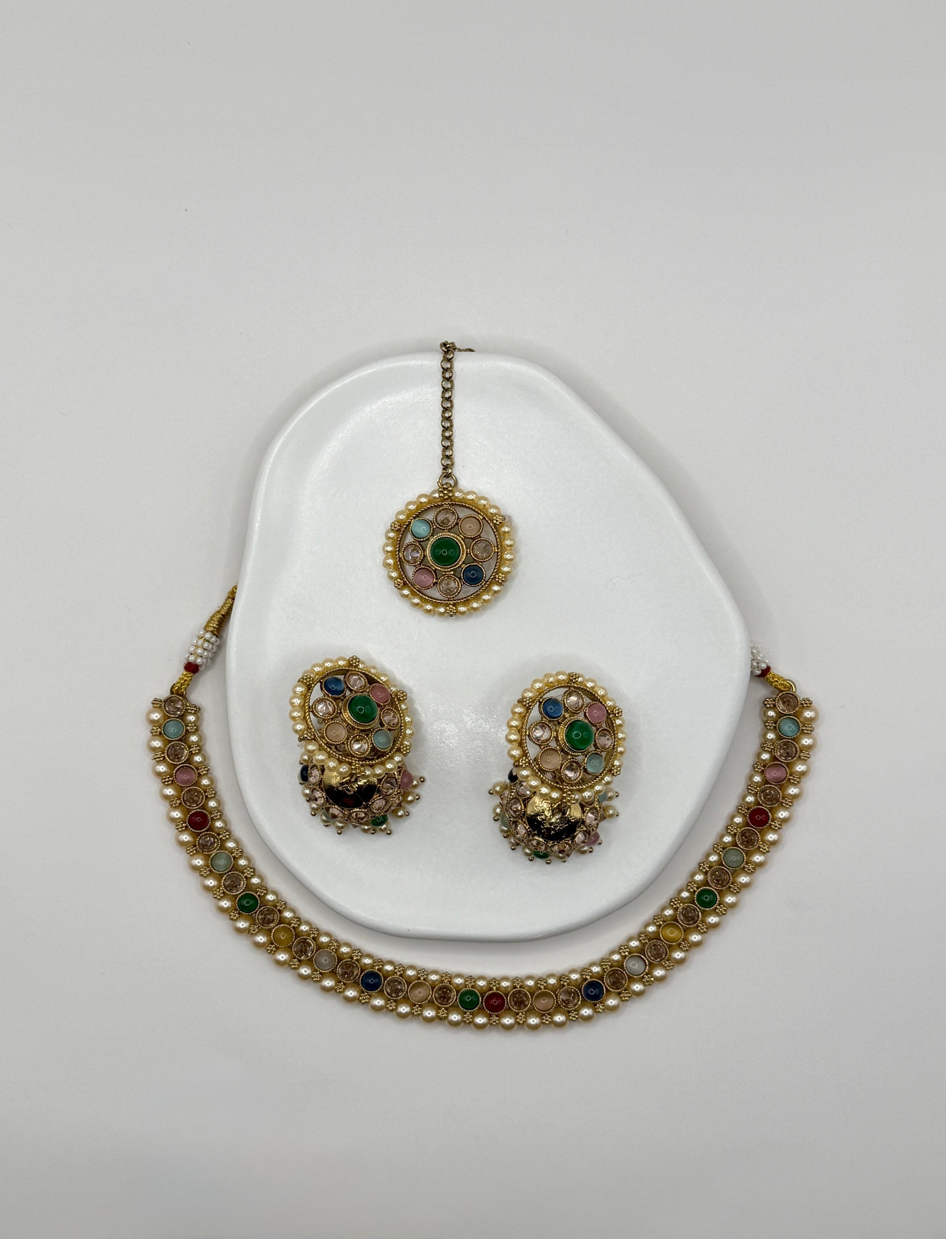 This beautiful Polki necklace set comes with matching jhumka earrings and a tikka — perfect for any occasion! It’s simple, lightweight, and easy to style with both traditional and modern outfits.