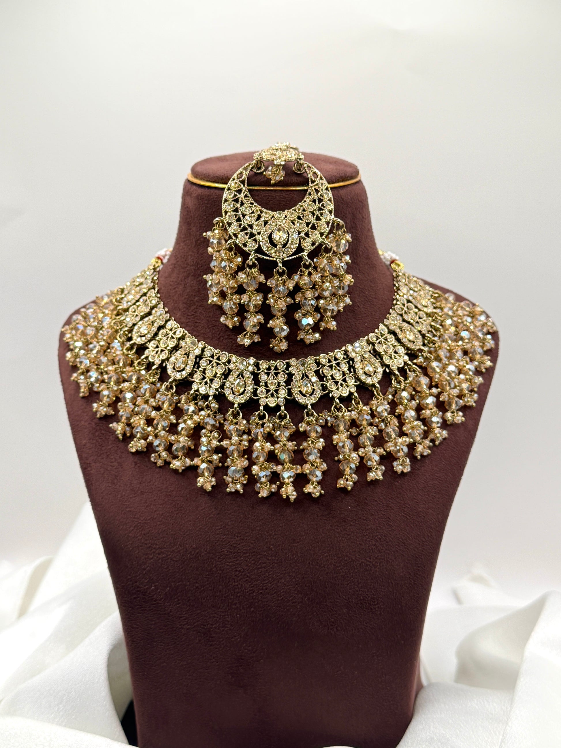 Light up the entire room with this show-stopping golden necklace set. It features a dazzling crystal finish, a matching tikka, and 3.5-inch earrings that make a bold statement. Perfect for weddings, celebrations, or any event where you want to stand out.