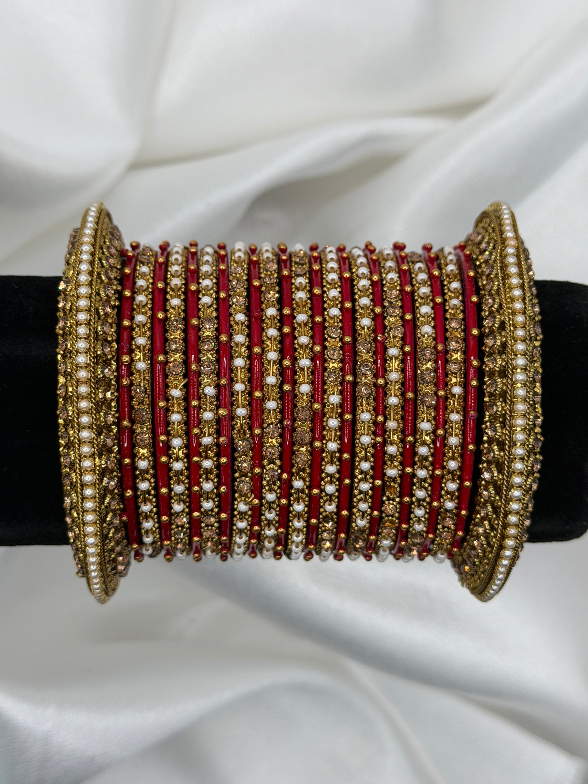 Add a bold pop of color with this 25-piece red and gold metal bangles set. Perfect for weddings, festivals, or everyday glam, these bangles bring instant elegance and vibrant charm to any outfit.