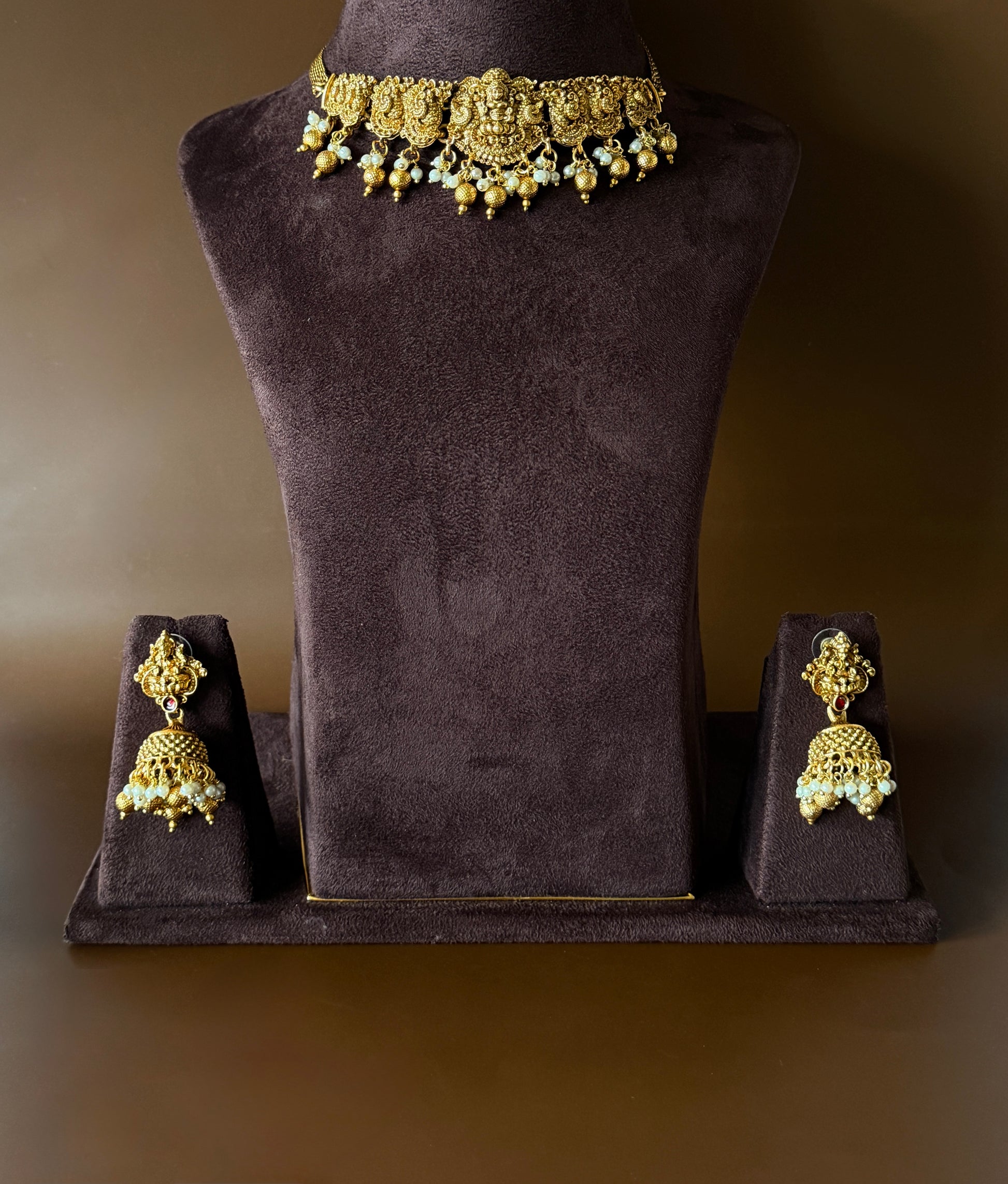 Featuring rich temple detailing and a bold, elegant fit, this choker set is paired with classic jhumkas—ideal for weddings and special occasions.